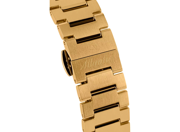 Корпус диаметром 40 мм изготовлен из высококачественной нержавеющей стали с золотистым покрытием, что придает часам изысканный вид и долговечность. Круглая форма корпуса и тонкий профиль (толщина всего 8.6 мм) подчеркивают классическую элегантность модели. Сапфировое стекло защищает золотистый циферблат, на котором индексы обеспечивают четкость и читаемость времени.