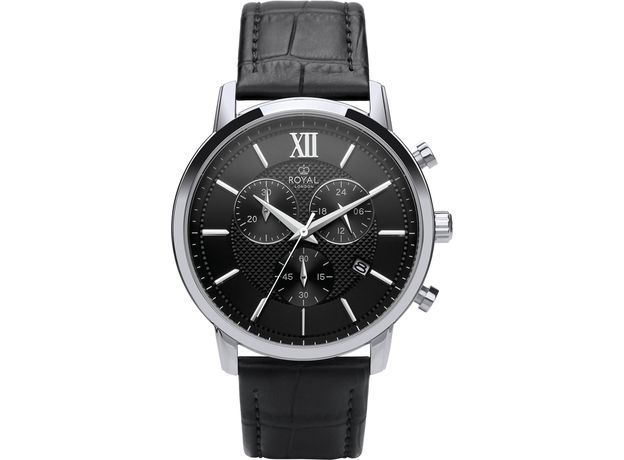 Перед Вами часы известного английского бренда ROYAL LONDON 41392-01. Эти часы выполнены в спортивно-классическом стиле - круглый корпус, кожаный ремешок и информативный циферблат. Корпус из нержавеющей стали, ремешок черного цвета прекрасно сочетается со стальным корпусом и красивым черным циферблатом. Гильошированный циферблат дополнен стальными стрелками и метками, а также внутренними циферблатами, отображающими данные хронографа. Окошко даты расположено на отметке 4 часа.