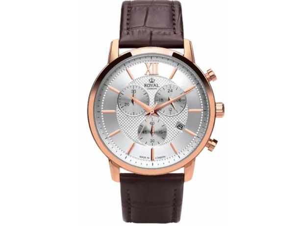Перед Вами часы известного английского бренда ROYAL LONDON 41392-04. Эти часы выполнены в спортивно-классическом стиле - круглый корпус, кожаный ремешок и информативный циферблат. Корпус из нержавеющей стали золотистого цвета, что достигается путем нанесения PVD покрытия на сталь, ремешок коричневого цвета прекрасно сочетается с желтым корпусом и красивым серебристым циферблатом. Гильошированный циферблат дополнен золотистыми стрелками и метками, а также внутренними циферблатами, отображающими данные хронографа. Окошко даты расположено на отметке 4 часа.