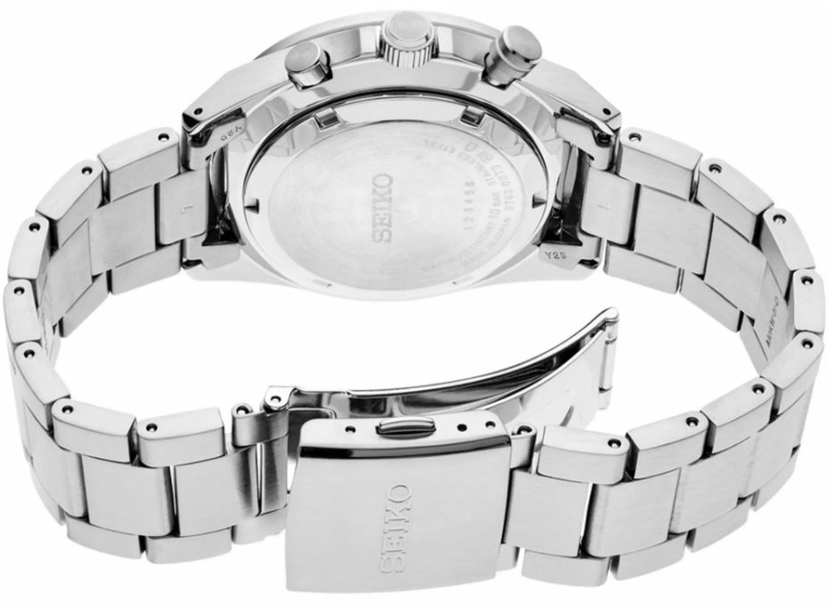 Отличительной чертой часов Seiko SSB405P1 является именно структурированный циферблат. Хорошо расположенные стрелки, как и индексы, покрыты люминесцентным составом, облегчающим чтение в условиях низкой освещенности. Циферблат защищен закаленным минеральным стеклом Hardlex. Корпус и браслет изготовлены из нержавеющей стали, цельностальная конструкция часов имеет практическую подоплеку – долговечность и универсальность. Водонепроницаемость этой модели составляет 100 м, поэтому часы выдерживают периодическое плавание на поверхности и душ. Также имеется указатель даты в положении от 4 до 5 часов. Диаметр корпуса 41 мм.