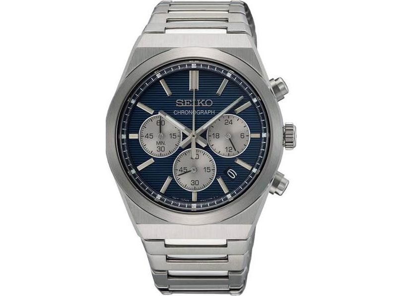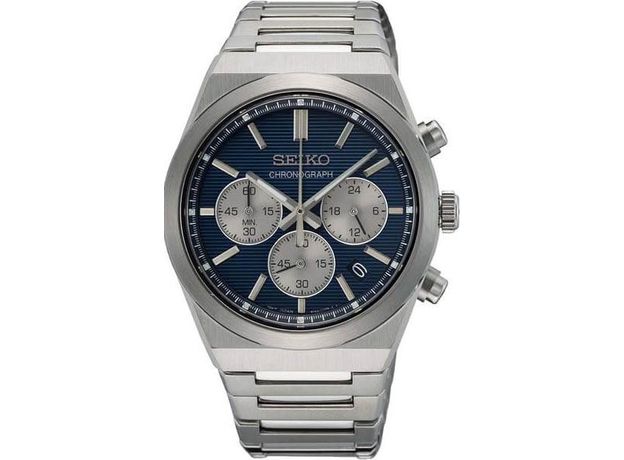 Seiko SSB453P1 - впечатляющая спортивная модель из серии Seiko Quartz Chronograph. Корпус и браслет часов изготовлены из нержавеющей стали. Синий циферблат, так называемый «панда», оснащен функцией даты и секундомера. Часы можно использовать для измерения интервалов длительностью до 30 минут – минутный счетчик расположен в положении «9 часов». Секундомером можно управлять боковыми кнопками – верхний секундомер включается и останавливается, нижний секундомер сбрасывает измеренные значения. Дополнительный циферблат с 24-часовым отображением времени расположен в положении «3 часа». Циферблат защищен закаленным минеральным стеклом Hardlex. Спортивный оттенок поддерживается тахиметрической шкалой, расположенной по периметру циферблата, благодаря которой скорость движущегося объекта можно измерить с помощью секундомера. Диаметр корпуса идеальный — 40 мм. Водонепроницаемость этой модели составляет 100 м, поэтому с часами можно плавать без каких-либо опасений.
