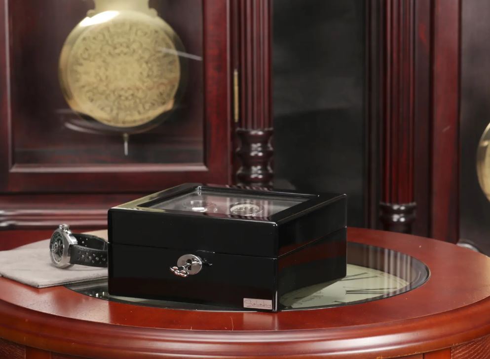 Перед ваши шкатулка для хранения 6-ти часов Salvadore 802-6BG. Данная модель представлена в черном цвете. Шкатулка изготовлена из лакированного дерева с тиснением под карбон, внутри она обшита светлым бархатом.