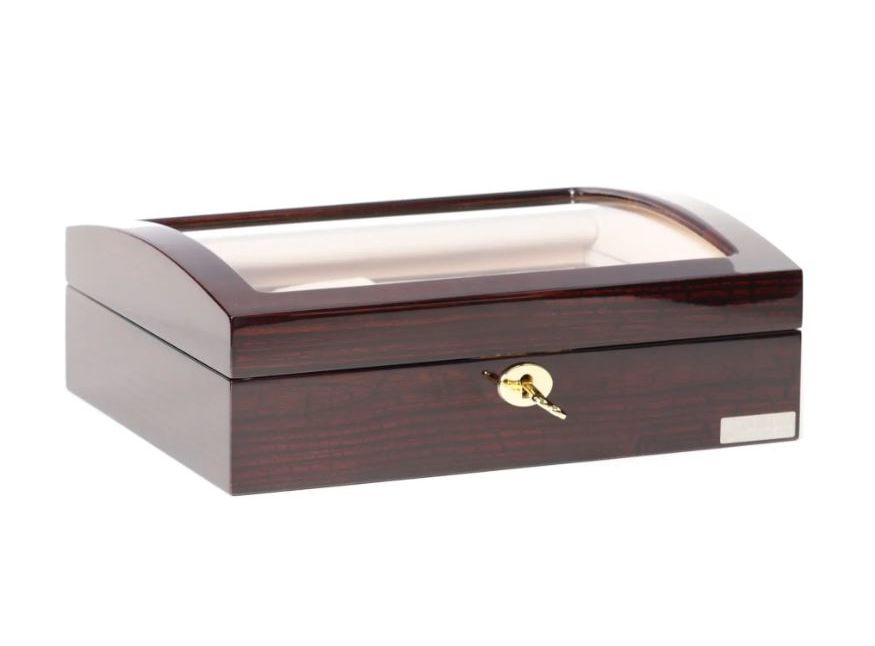 Модель выполнена в бордовом цвете имеет приятный внешний вид в верх шкатулки установлено стекло, что позволяет посмотерть какие модели помещены.