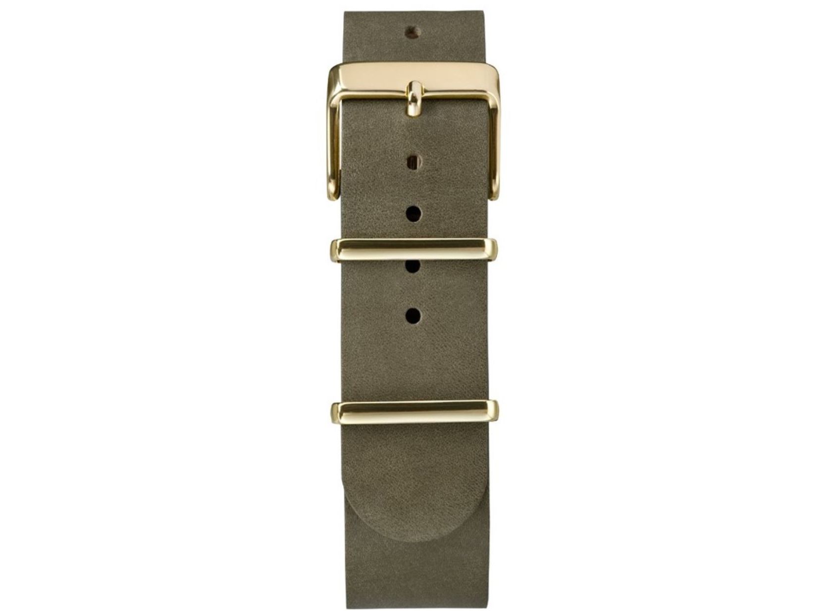 Корпус часов изготовлен из нержавеющей стали с PVD покрытием лимонного цвета, ремешок кожаный защитного цвета со стандартной застежкой с шипом. Циферблат бежевого цвета с контрастными позолоченными стрелками и метками.