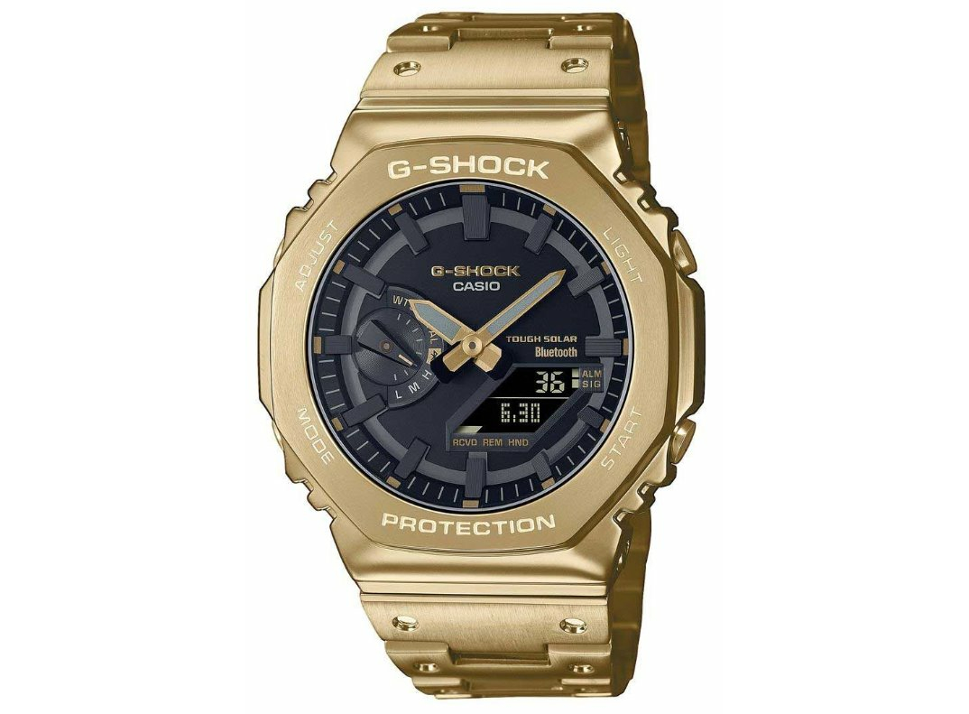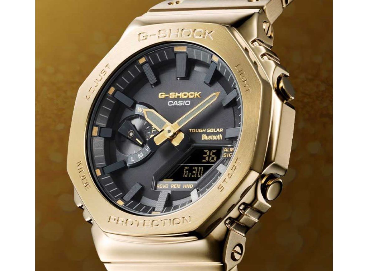 Міцний сталевий корпус годинника доповнюється сталевим браслетом з жовтим IP-покриттям. Поверхневе покриття корпусу було спеціально оброблене DLC, що забезпечує ще більшу довговічність. Циферблат захищений мінеральним склом. Для зручності читання в умовах низького освітлення годинник оснащений люмінесцентними стрілками та подвійним світлодіодним підсвічуванням, яке висвітлює як аналогову, так і цифрову частини циферблата одним натисканням кнопки. У положенні «9 годин» знаходиться додатковий циферблат, що показує поточний режим, а цифровий дисплей показує дані, що стосуються вибраного режиму. Завдяки системі на сонячній енергії, в якій батарея годинника заряджається від природного та штучного світла, немає необхідності в регулярній заміні батареї. Діаметр корпусу 44,4 мм ставить модель в один ряд з більшим годинником. Водонепроникність цієї моделі становить 200 м, тому з годинником можна легко плавати. Асортимент Casio G-Shock пропонує відповідний годинник для тих, хто шукає поєднання міцного спортивного годинника з привабливим дизайном у поєднанні з багатим набором функцій. Всі моделі цієї всесвітньо популярної лінійки більш стійкі до ударів, ніж звичайний годинник. Вони також демонструють підвищену стійкість до магнітних полів.