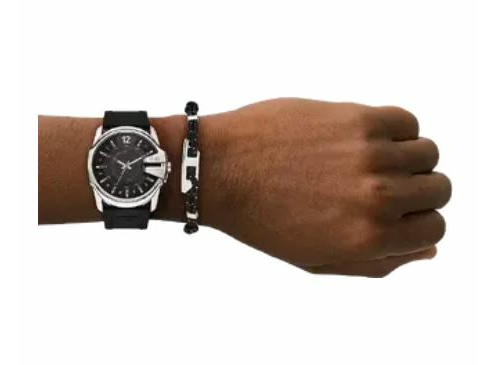 Комплект DZ4700SET включає додатковий браслет (аксесуар),Браслет виготовлений із плетеного чорного шнура (мотузки) з білими вкрапленнями та металевою застібкою .Дизайн браслета є мілітарі-індустріальним, що гармонійно доповнює сміливу естетику годинника Diesel.