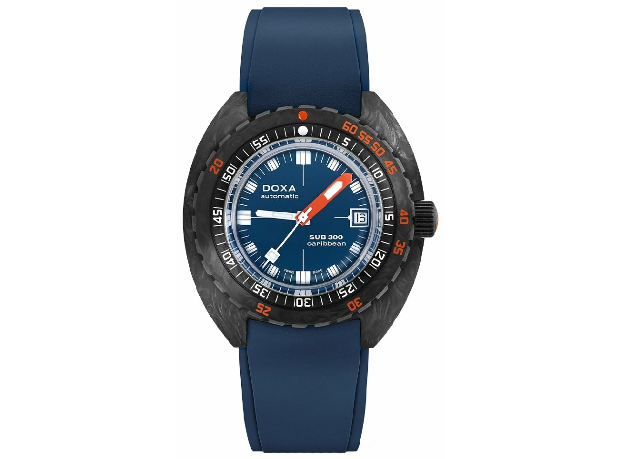 Чоловічий дайверський годинник Doxa Carbon Caribbean з кованого вуглецевого волокна залишається вірним своїм витокам, але при цьому відрізняється суворішим, технічнішим і, отже, міським дизайном. Переносячи легенду в майбутнє, вони пропонують високу продуктивність, що відповідає високим стандартам сучасного дайверського годинника. Завдяки використанню сучасних легких матеріалів ці автоматичні дайверські годинники Doxa мають функціональність, безцінну як для підводного плавання, так і для повсякденного носіння. Цей дайверський годинник серії SUB 300 оснащений міцним карбоновим корпусом розміром 42,5 x 45 мм, який, крім легкості і практичності, захищає механізм і заводну головку, що загвинчується, з ексклюзивним символом риби DOXA. Водонепроникність складає 300 метрів, що відповідає глибині близько 980 футів. Ремінці кріпляться до темно-синього ремінця з логотипом DOXA з обох боків, регульованого подовжувача і застібці з чорним PVD-покриттям, що розкладається, прикрашеної розкішним символом риби DOXA. Унікальний храповий механізм, вбудований в інноваційну еластичну застібку, дозволяє годинникам легко носитися на зап'ястя, навіть якщо на вас одягнена гідрокостюм.