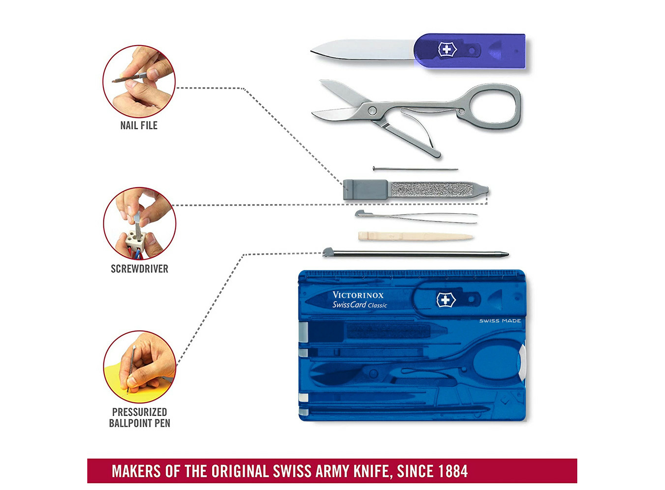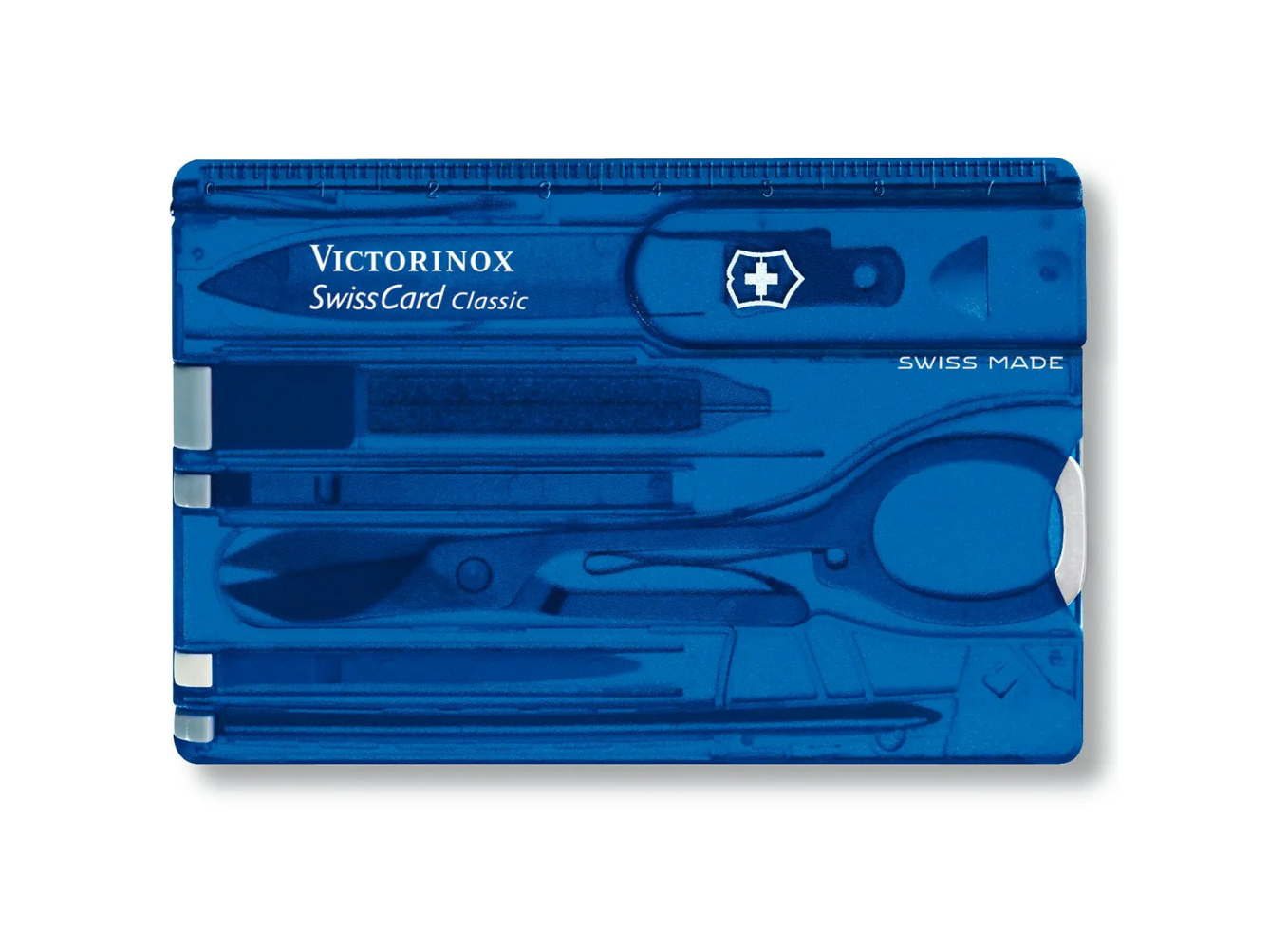 Не має значення, чи ви в офісі, у подорожі, чи просто в місті — SwissCard Classic завжди напоготові. Завдяки товщині всього 4 мм ця карта вміщує 10 функціональних інструментів, зокрема гострі ножиці, практичну ручку, шпильку та навіть викрутку.