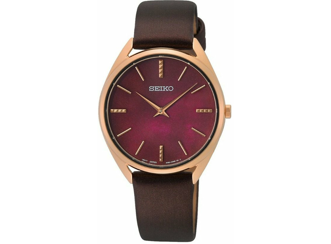 Бордово-червоний циферблат з годинниковими позиціями та індексами з тисненням із рожевого золота одразу впадає у вічі. Він захищений загартованим мінеральним кристалом Hardlex. Корпус годинника виконаний з нержавіючої сталі і вдало доповнений шкіряним ремінцем, поверхня годинника покрита PVD напиленням кольору рожевого золота. Окрім циферблату та оздоблення, загальне враження доповнює незвичайна заводна головка. Перевагою годинника, безсумнівно, є дуже чистий та класичний дизайн без застосування страз або використання інших прикрас, що надає годиннику непідвладного часу вигляду. Водонепроникність годинника становить 50 м - вони витримують контакт з водою при миття рук і прийнятті душу. Якщо ви шукаєте простий годинник, що підходить як аксесуар на кожен день і для особливих випадків, Seiko SWR082P1 — правильне рішення завдяки ідеальному розміру корпусу 32 мм і незвичайному зовнішньому вигляду.
